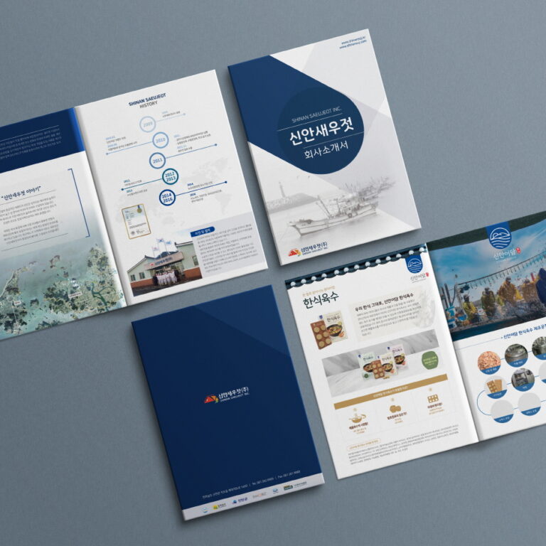 PROJECT Subject : 신안새우젓 브로슈어 디자인 Client : 신안새우젓(주) Period : Mar – Jun 2021 Tools : Photoshop, Illustrator BRAND COLOR CONCEPT 신안새우젓으로 만든 천연조미료 제품을 소개하는 브로슈어를 디자인하였습니다. 회사소개 및 비전철학을 차례대로 배치하고, 제품을 소개하면서 제품의 제조공정을 보여주어 구매욕구를 불러일으킬 수 있도록 레이아웃을 구성하였습니다.