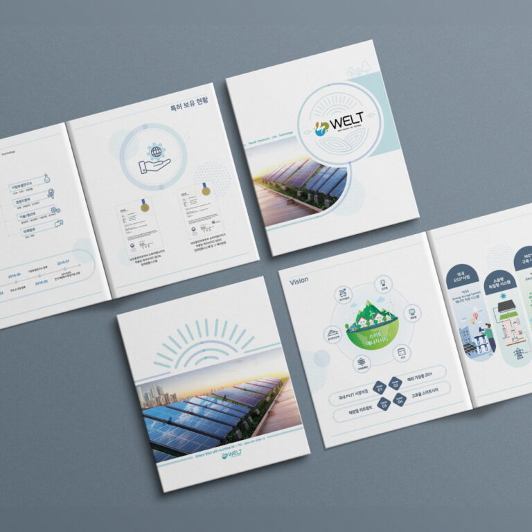 PROJECT Subject : 웰트 브로슈어 디자인 Client : WELT Period : Jul – Sep 2019 Tools : Photoshop, Illustrator BRAND COLOR CONCEPT 신재생에너지솔루션을 제공하는 기업소개 브로슈어를 제작하였습니다. 원형의 이미지와 둥근 모양의 아이콘을 사용하여 순환하는 재생에너지를 간접적으로 표현하고 있습니다. 강렬하지 않은 파스텔 톤 색상을 사용하여 전반적으로 산뜻하면서도 밝은 분위기를 주도록 구성하였습니다.