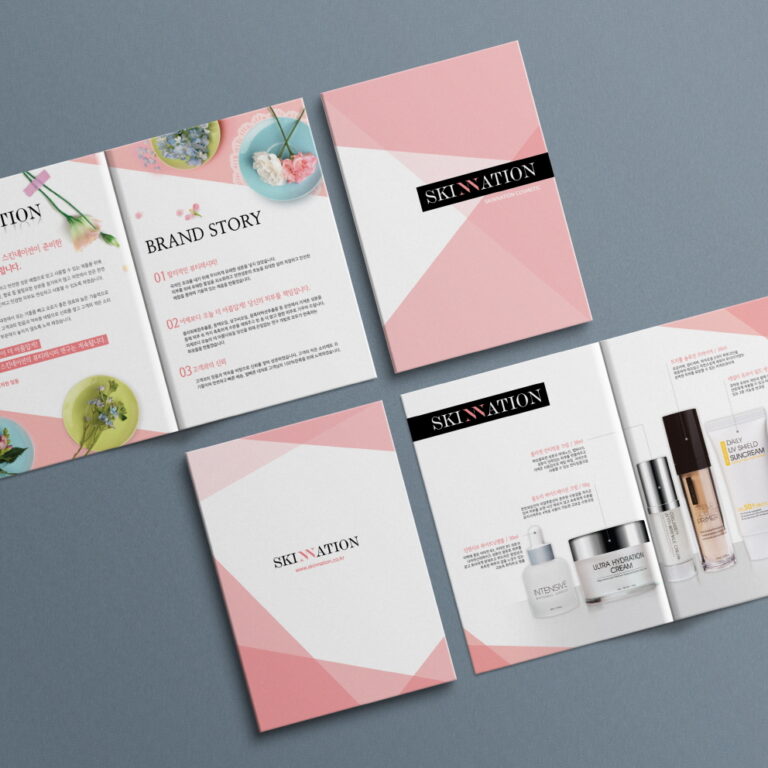PROJECT Subject : 스킨네이션 브로슈어 디자인 Client : 하이커머스 Period : Apr – Jun 2017 Tools : Photoshop, Illustrator BRAND COLOR CONCEPT 피부에 유해한 물질을 최소화하고 안전한 성분 배합을 강조하는 화장품을 판매하는 고객사의 브랜드 소개 브로슈어를 제작하였습니다. 브랜드 로고에서 핑크톤의 포인트 색상을 잡아 제목을 강조하기 위해 색상을 사용하여 시선이 분산되지 않고, 사선 레이아웃으로 흰 여백에…