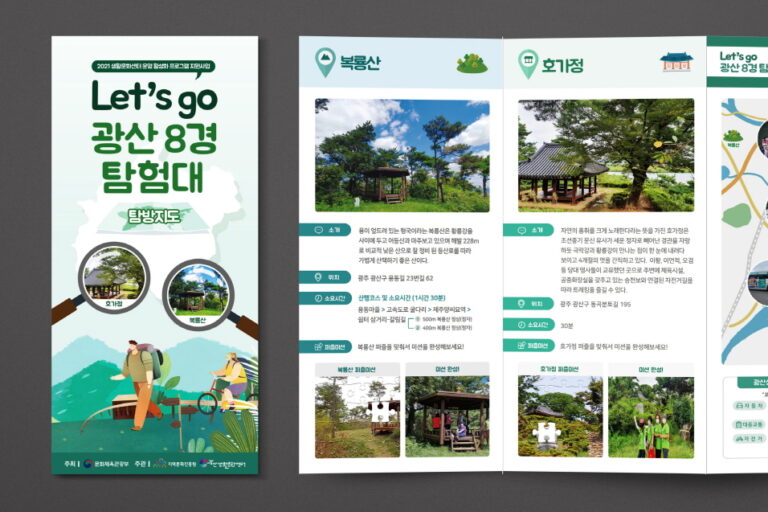 PROJECT Subject : Let’s go 광산8경 탐험대 리플렛 디자인 Client : 광산문화원 Period : Oct – Dec 2021 Tools : Photoshop, Illustrator BRAND COLOR CONCEPT 2021 생활문화센터 운영 활성화 프로그램 지원사업의 일환으로 광산생활문화센터 주변의 광산8경을 소개하는 탐방지도를 리플렛으로 제작하였습니다. 주변 관광지를 탐방하고 퍼즐을 모으는 참여형 리플렛이며, 초록 색상을 메인컬러로 사용하여 나무가 우거진 복룡산 탐방지도의 느낌을…