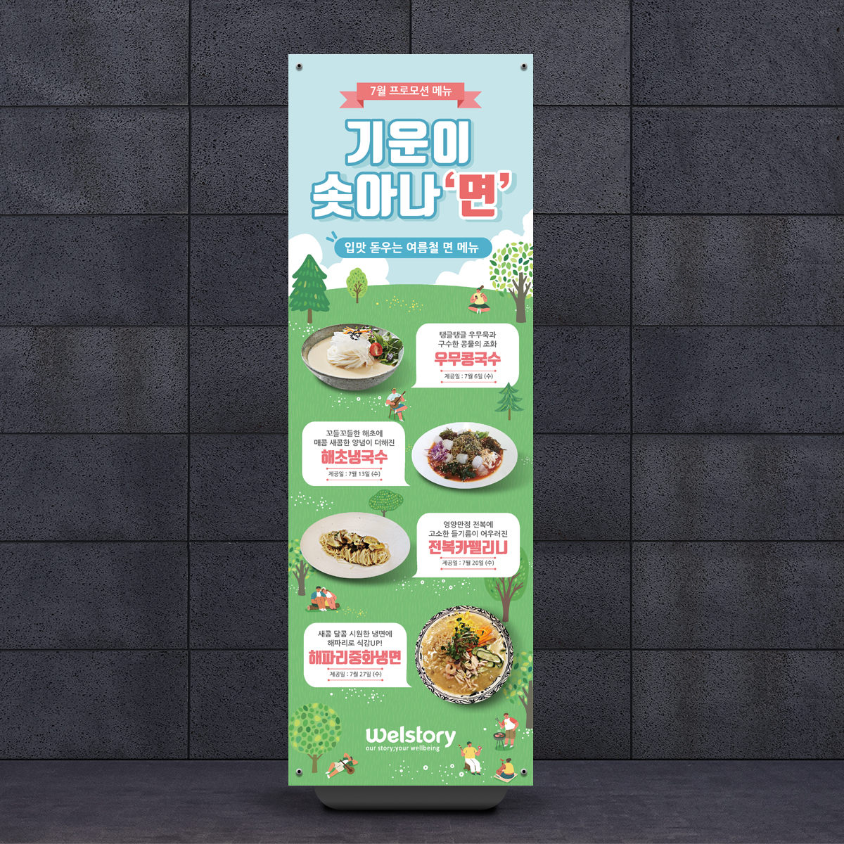 삼성 웰스토리 X배너 중 하나로, ‘기운이 솟아나면’이라는 7월 프로모션 주제로 배너 디자인 작업을 하였습니다. 상단 배경에는 뭉게구름 일러스트를 통해 상승의 이미지를 주고, 각 음식 메뉴 이름에는 핑크톤으로 포인트를 주어 배너를 멀리서 보더라도 쉽게 확인할 수 있도록 디자인하였습니다.