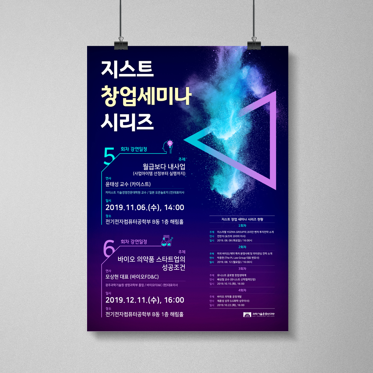 지스트에서 주관하는 창업세미나 시리즈를 주제로 강연일정과 시리즈 현황을 포스터에 담아 디자인하였습니다.