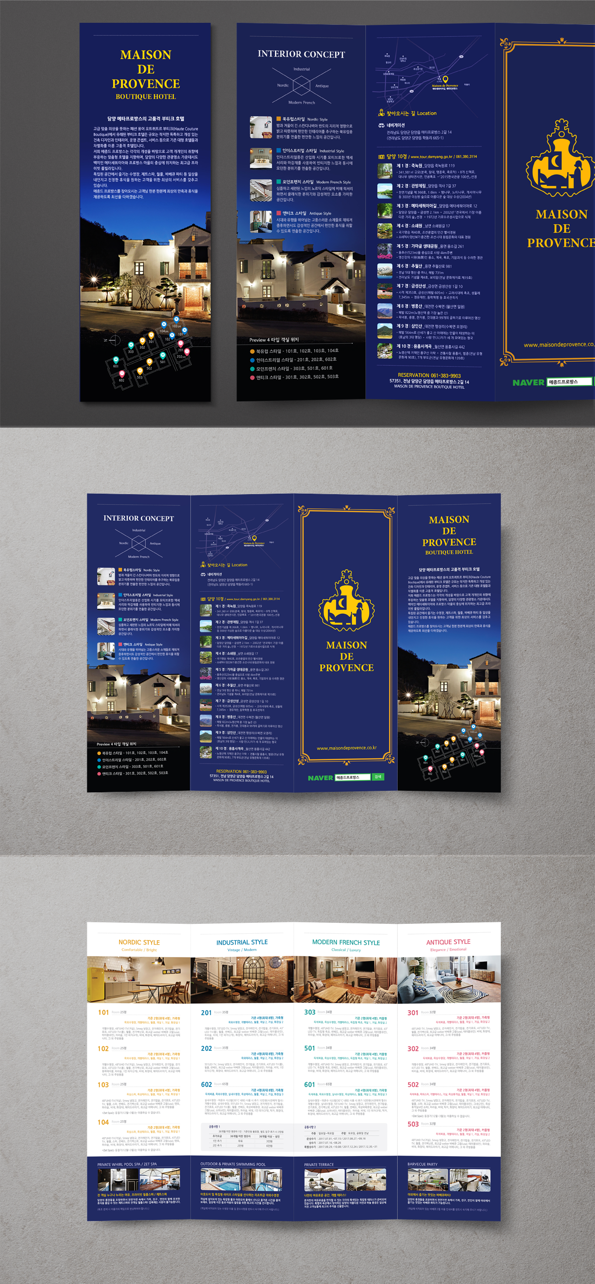 고품격 부티크 호텔의 이미지를 표현하기 위해 네이비와 옐로우 계열 색상을 사용하였고, 인덱스 페이지에 객실 위치를 프리뷰로 간단하게 표현하여 객실 위치를 한눈에 파악할 수 있도록 디자인하였습니다. 객실 스타일과 색깔을 매치하여 객실을 분류하였습니다.
