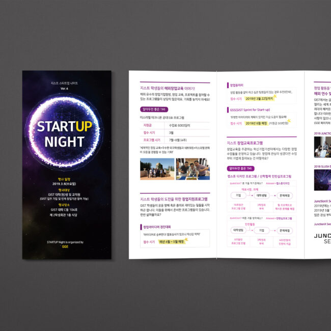 PROJECT Subject : 지스트 스타트업 나이트 Ver.4 리플렛 디자인 Client : GIST Period : Jan – Mar 2019 Tools : Photoshop, Illustrator BRAND COLOR CONCEPT 광주과학기술원 창업진흥센터에서 창업문화활성화를 위한 목적으로 제작된 리플렛으로, 스타트업 나이트라는 주제에 맞게 색상을 배치하였습니다. 어두운 배경에는 노란색으로 배색 효과를 주어 제목을 강조하는 효과를 주었습니다. 흰색 배경에는 노란 별 표시를 통해 강조하는…
