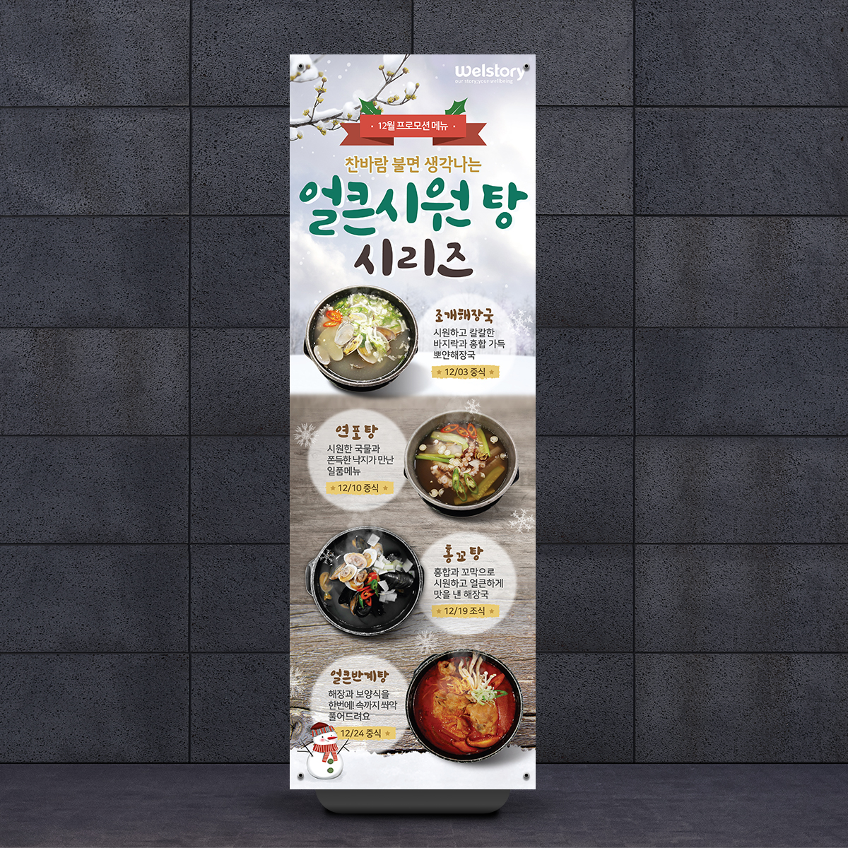 삼성 웰스토리 X배너 중 하나로, 찬바람 불면 생각나는 얼큰시원탕 시리즈라는 12월 프로모션 주제로 배너 디자인 작업을 하였습니다. 추운 날의 눈 쌓인 이미지와 따뜻한 국물요리를 배경으로 전체적으로 겨울이 생각나는 짙은 갈색부터 색상톤을 매치하였습니다. 상단에는 크리스마스가 연상되는 장식을 달아 겨울 이미지를 강하게 주었습니다.