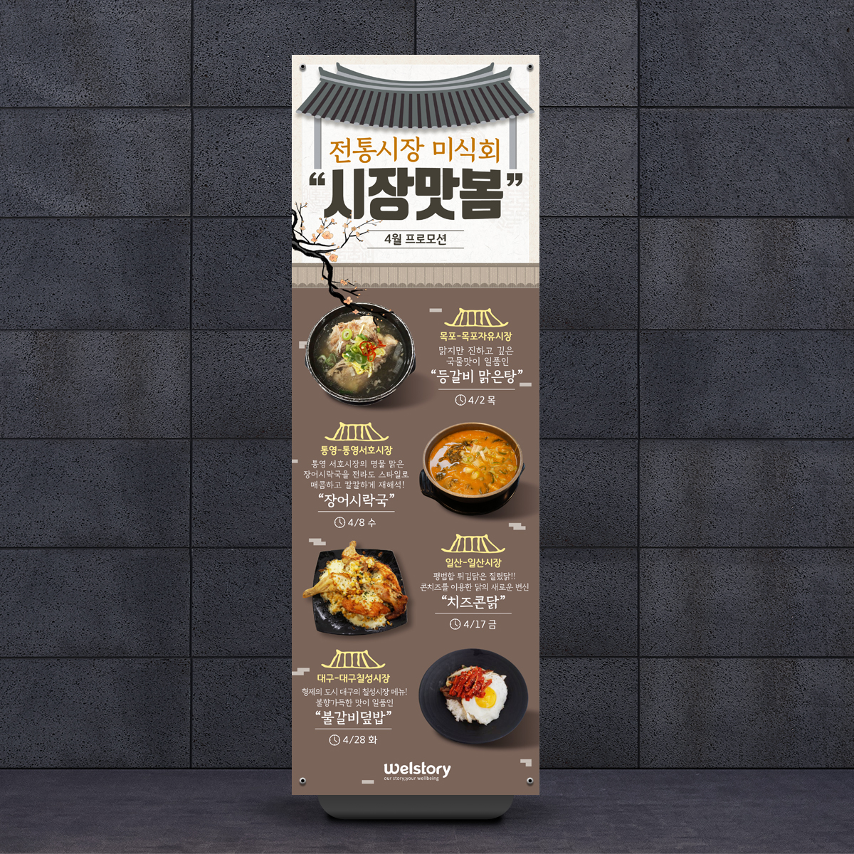 삼성 웰스토리 X배너 중 하나로, 전통시장 미식회 시장맛봄이라는 4월 프로모션 주제로 배너 디자인 작업을 하였습니다. 전통이라는 단어에서 떠오르는 기와 이미지와 담벼락 일러스트를 사용하여 지역 시장의 유명한 음식을 배너에 담았습니다. 부드러운 난색 계열 컬러를 사용하여 친근한 느낌을 주고, 짙은 갈색 색상톤을 매치하였습니다.